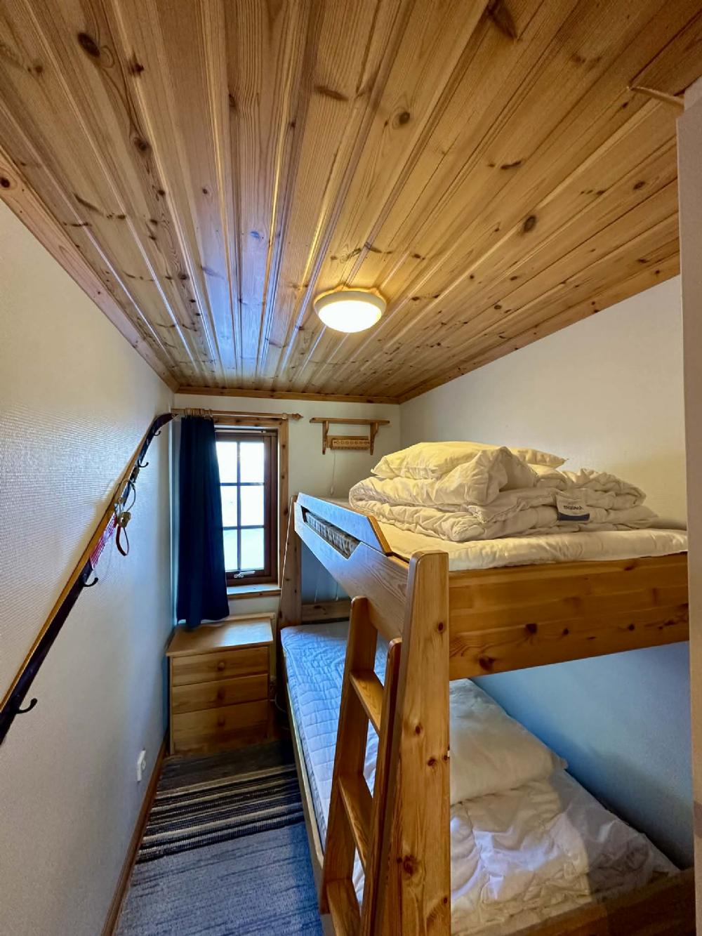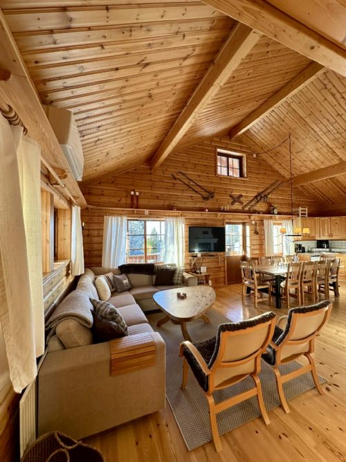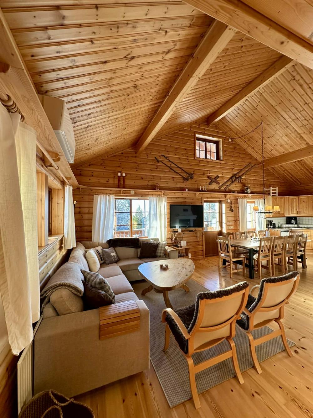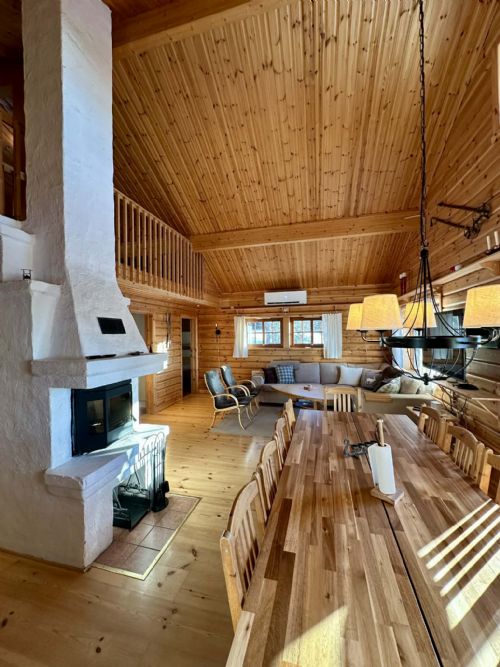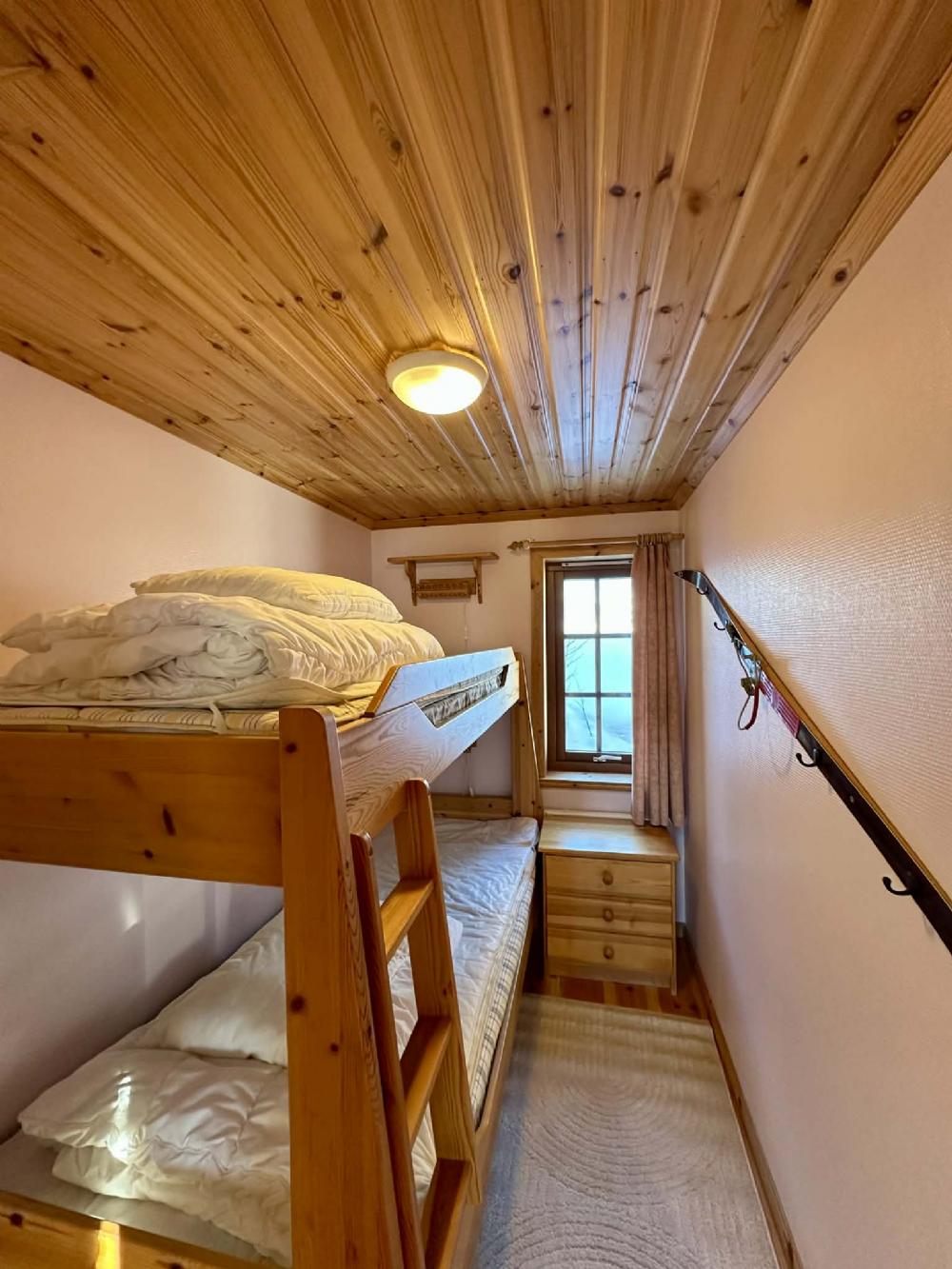 High ceilings and lovely views across the valley. 4 bedrooms downstairs, one with a double bed, 3 with bunk beds, loft with two single beds and space for extra bed on the mattress. High chair and cot available. A separate small toilet, a shower / toilet / sauna. Hall with underfloor heating. You ski down to Björnidet where several lifts begin and it is walking distance to Björnrikekcentrat with supermarket, ski shop and restaurant.